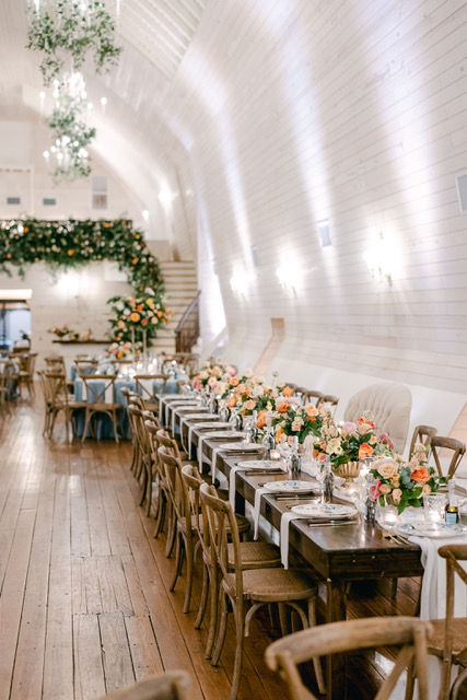 Located on the second floor of the Main Barn is the Great Hall. Adorned with 12 chandeliers, 34ft ceilings, and its original floors, the hall is truly breathtaking.
